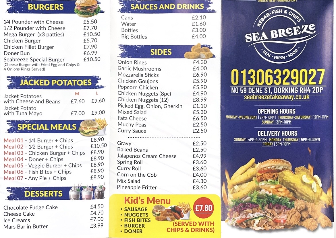 Sea Breeze at 59 Dene St in Dorking delivers a menu that effortlessly balances classic comfort food with hearty options for all tastes. The selection of pies like Fish, Chicken Mushroom Pie, Beef Onion Pie, and Steak and Kidney Pie offers traditional British flavors, while the wraps-from Sausages, Chicken, and Lamb Doner Wraps to Mix Doner Wraps-provide quick, satisfying handheld meals. Fans of grilled meats will enjoy the kebabs, including Lamb Doner, Chicken Doner, Lamb Shish, Chicken Shish, and Combination Kebabs, perfect for sharing or pairing with sides like Chips, Cheesy Chips, Cheesy Chips & Beans, Chip Butty, and Curly Fries. The burgers range from the classic 1/4 Pounder with Cheese to the indulgent Mega Burger (x3 patties), with options like Chicken Burger and Chicken Fillet Burger adding variety. For lighter options, Jacket Potatoes with toppings such as Cheese and Beans or Tuna Mayo hit the spot, while special meals like Meal 01 - 1/4 Burger + Chips through Meal 05 - Veggie Burger + Chips cater to both solo diners and families. Sides like Onion Rings, Garlic Mushrooms, Mozzarella Sticks, Chicken Goujons, and Popcorn Chicken round out the experience, complemented by sauces and drinks in cans, bottles, and larger sizes. Sweet cravings are addressed with Ice Cream, Chocolate Fudge Cake, Cheese Cake, and inventive treats like Mars Bar in Butter Ice Cream. Even younger guests are considered, with the Kid’s Menu offering Sausage, Nuggets, Fish Bites, Burger, and Doner. From traditional British staples to indulgent snacks and hearty mains, the menu at Sea Breeze showcases variety, generous portions, and something for every palate.